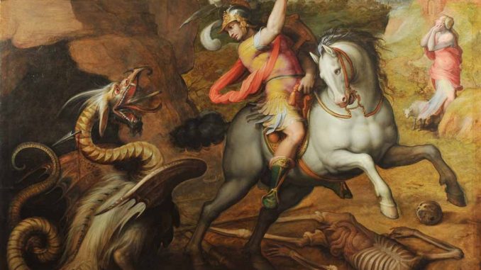 Az előkelő perzsiai származású György lovagot a római hadseregben tanúsított hősiességének elismeréséül Diocletianus császár kegyeibe fogadta, és tekintélyes állami hivatalhoz juttatta. A Krisztus hívővé vált ifjú azonban nem helyeselte az uralkodó kegyetlen keresztényüldöző politikáját, sőt szembe is szállt vele. Ezért börtönbe vetették és miután a kínzások sem tudták eltéríteni a hitétől Kr. u. 303-ban kivégezték. Vértanúként mind a keleti, mind a nyugati egyház szentként tiszteli. A róla szóló legendák melyben legyőzte a szépséges királylányt fogva tartó sárkányt, valamennyi európai nép folklórjában ismeretesek. A páncélban lovon ülő, és dárdájával ölő ifjút a képzőművészet számos formában megörökítette. Alakját Kolozsvári Márton és György prágai szoborcsoportja őrzi számunkra a legemlékezetesebben, aminek egyik hű másolata a mai napig Kolozsváron is megtalálható.